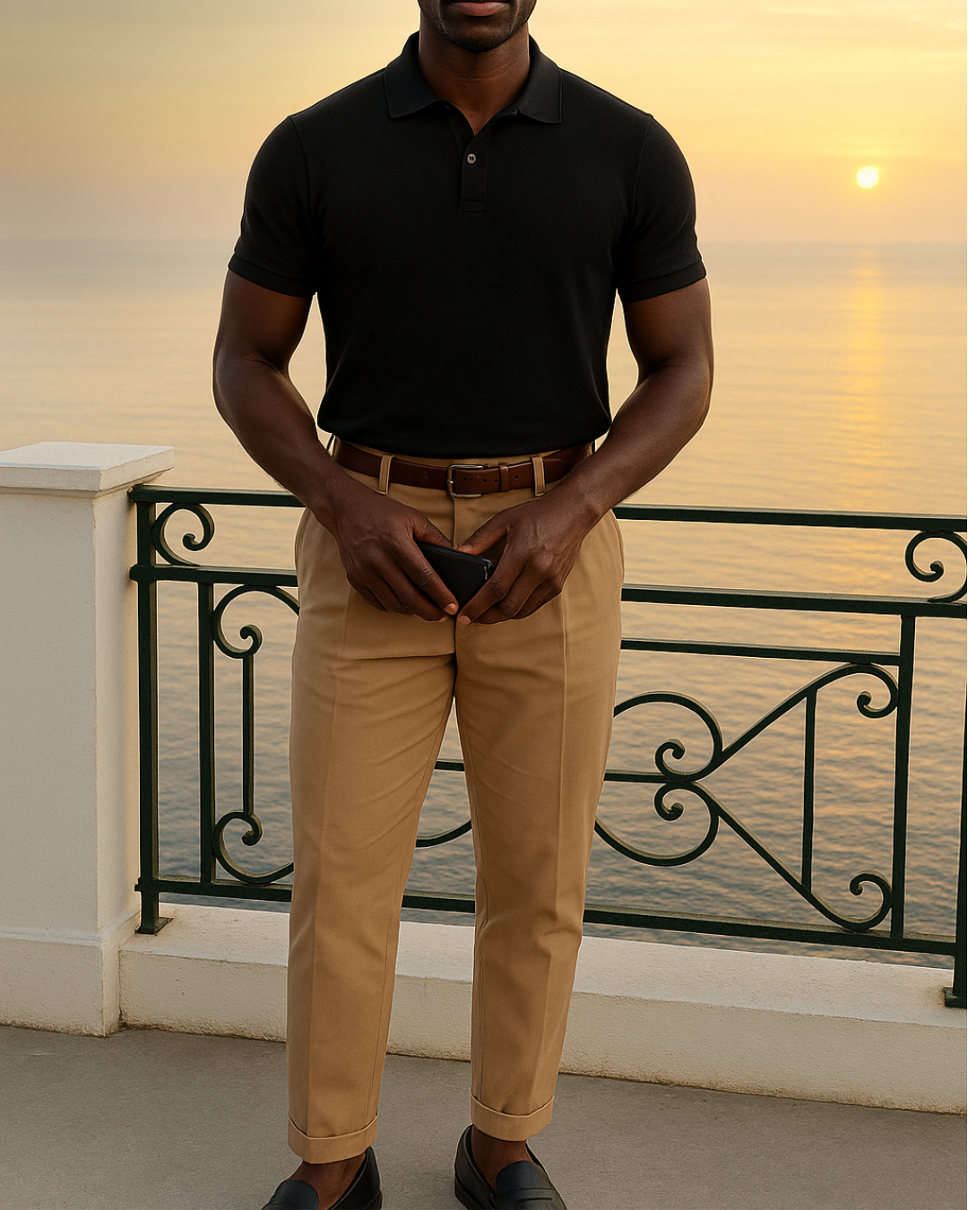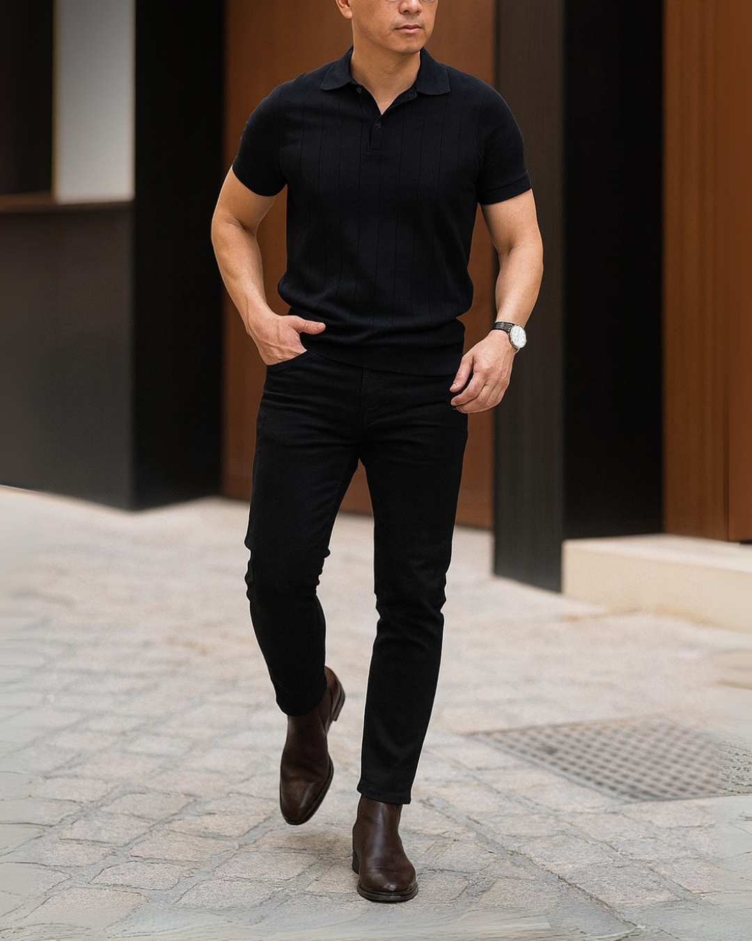 No primeiro look, a opção all black bem construída que transmite poder e estilo sem esforço. Já no segundo, a dupla mistura o ar urbano da polo com o toque casual do calça khaki. Ótimo para ocasiões diurnas. E para finalizar a combinação da polo preta com alfaiataria cinza traz o equilíbrio ideal entre sofisticação e modernidade.