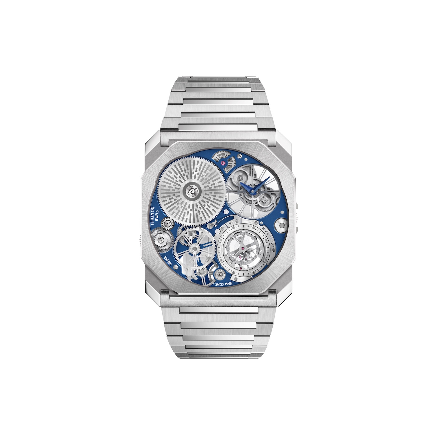 Outro destaque é o Octo Finissimo Ultra Tourbillon Platinum, com 1,85 mm de espessura total. O modelo mantém o recorde de flying tourbillon mais fino do mundo e será produzido em edição limitada de dez peças. A nova versão utiliza caixa e pulseira em platina e traz detalhes em azul no mostrador esqueletizado.