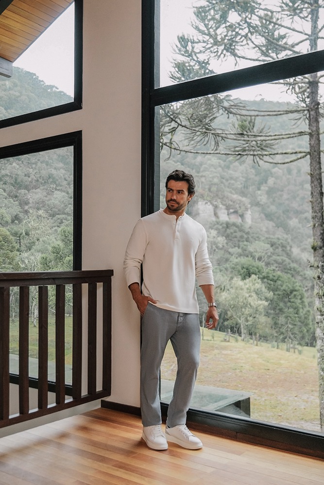 Jaquetas em diferentes shapes e tricôs em variados fios ganham destaque. A cartela aposta em tons neutros, como bege e off-white, enquanto o marrom adiciona profundidade à temporada. Tecidos como o algodão egípcio com elastano reforçam conforto, caimento preciso e funcionalidade para o dia a dia.