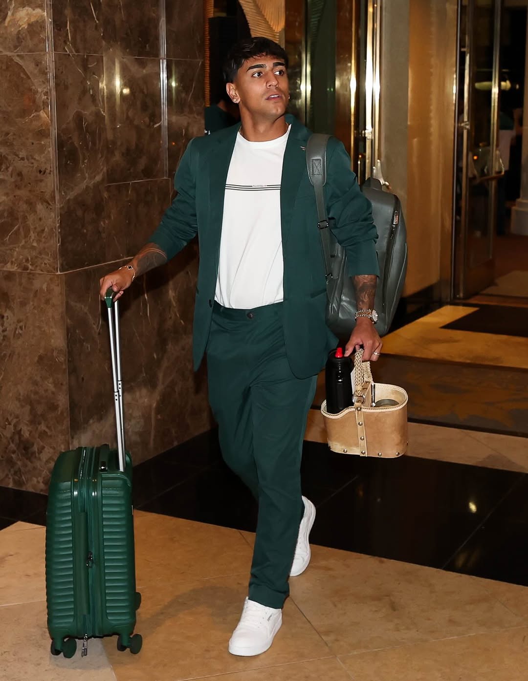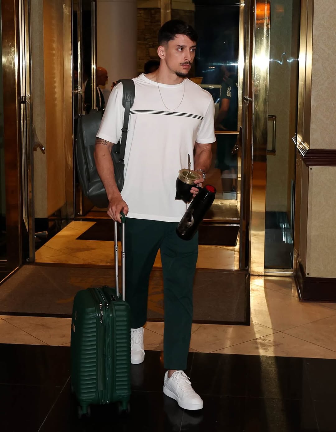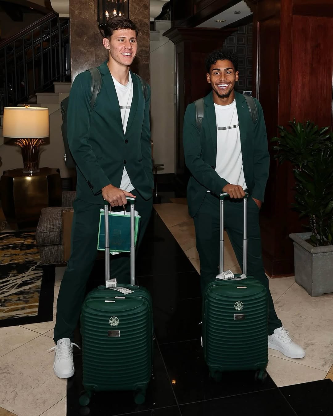 O uniforme desenvolvido para a delegação alviverde reúne alfaiataria e conforto. O costume é feito com tecido tecnológico de alta maleabilidade, garantindo elegância e liberdade de movimentos. A camiseta que compõe o visual é produzida com fibra de modal, oferecendo leveza e respirabilidade para os compromissos do time durante o torneio.