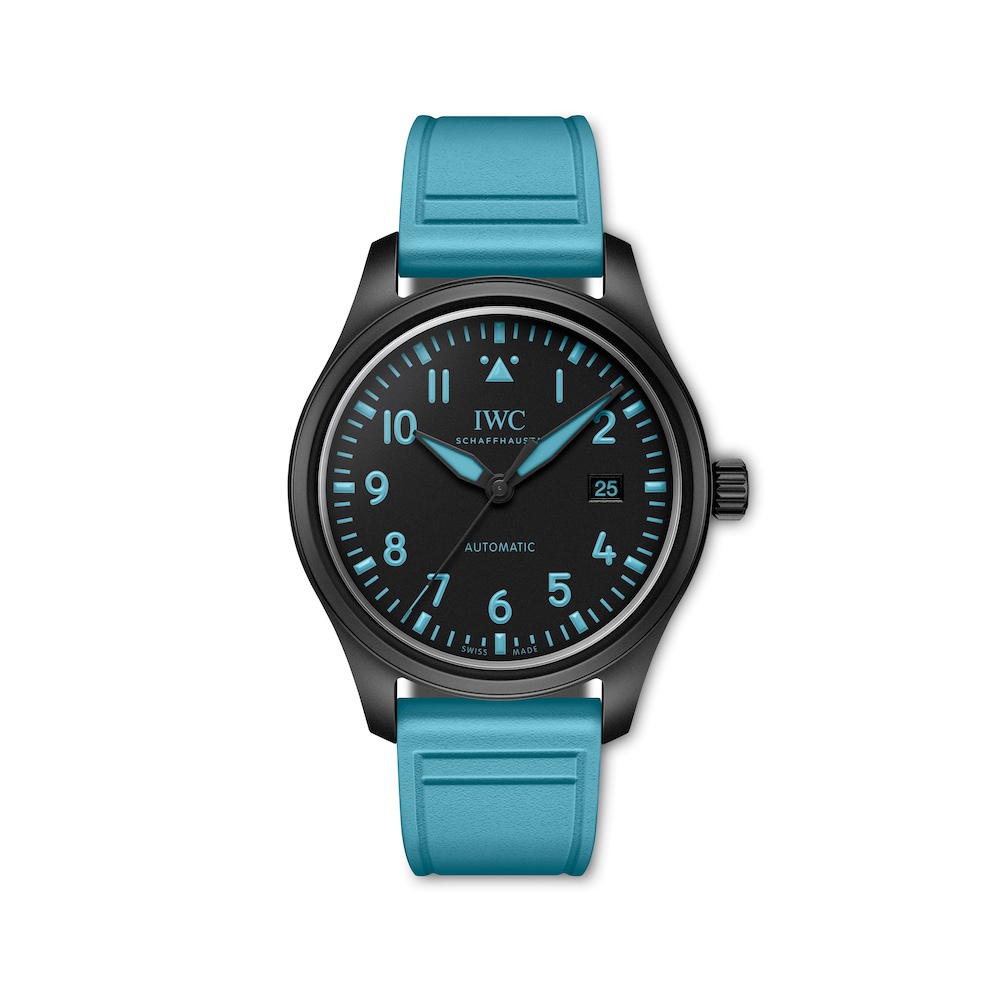 Os novos modelos — Pilot Chronograph 41 George Russell (ref. IW389411) e Pilot Automatic 41 George Russell (ref. IW328107) — são produzidos em cerâmica preta de óxido de zircônio, material de alta resistência já consolidado no portfólio da manufatura suíça. Os mostradores pretos recebem índices, numerais e ponteiros com luminescência em azul intenso, tonalidade associada à identidade visual do piloto britânico e presente também em seu capacete.