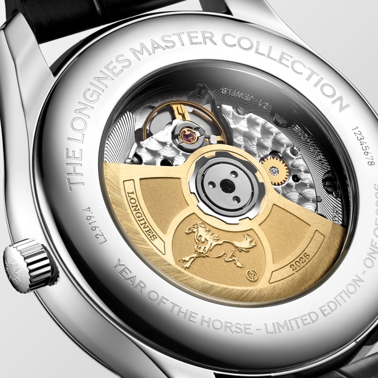 No fundo transparente, o relógio revela seu elemento mais simbólico: o rotor dourado gravado com a imagem de um cavalo a galope, inspirado na obra do artista chinês Xu Beihong, desenvolvida em parceria com o Museu de Arte Peon. A representação traduz conceitos como força, impulso e progresso — valores ligados tanto ao Ano do Cavalo quanto à identidade histórica da Longines.