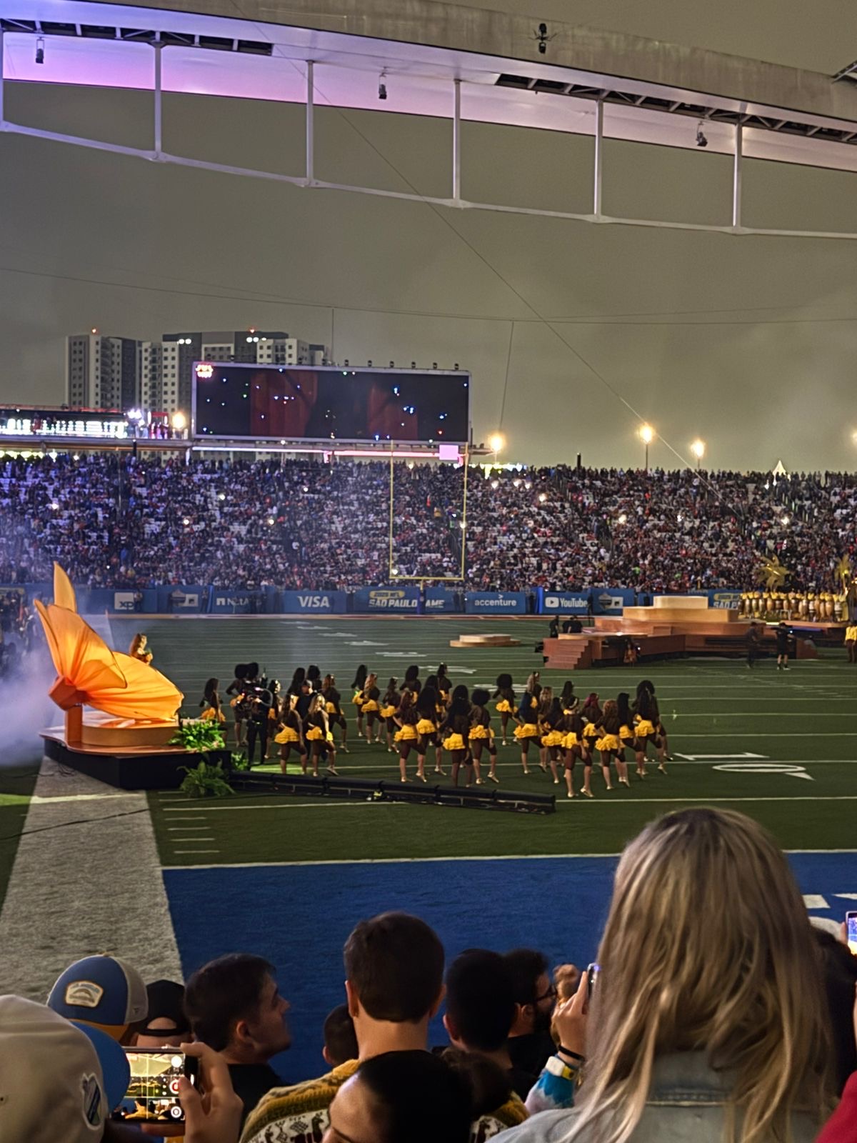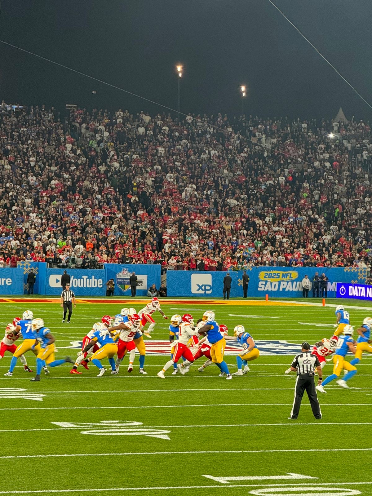 Sentamos na fileira G, quase beijando o gramado. Que adrenalina! É a segunda vez que eles fazem um jogo da NFL no Brasil, ambos na Neo Química Arena, o estádio do Corinthians.