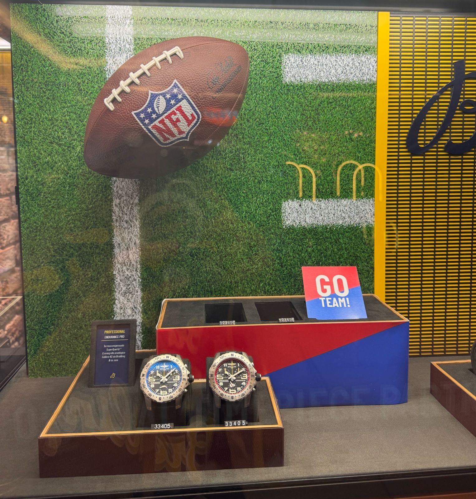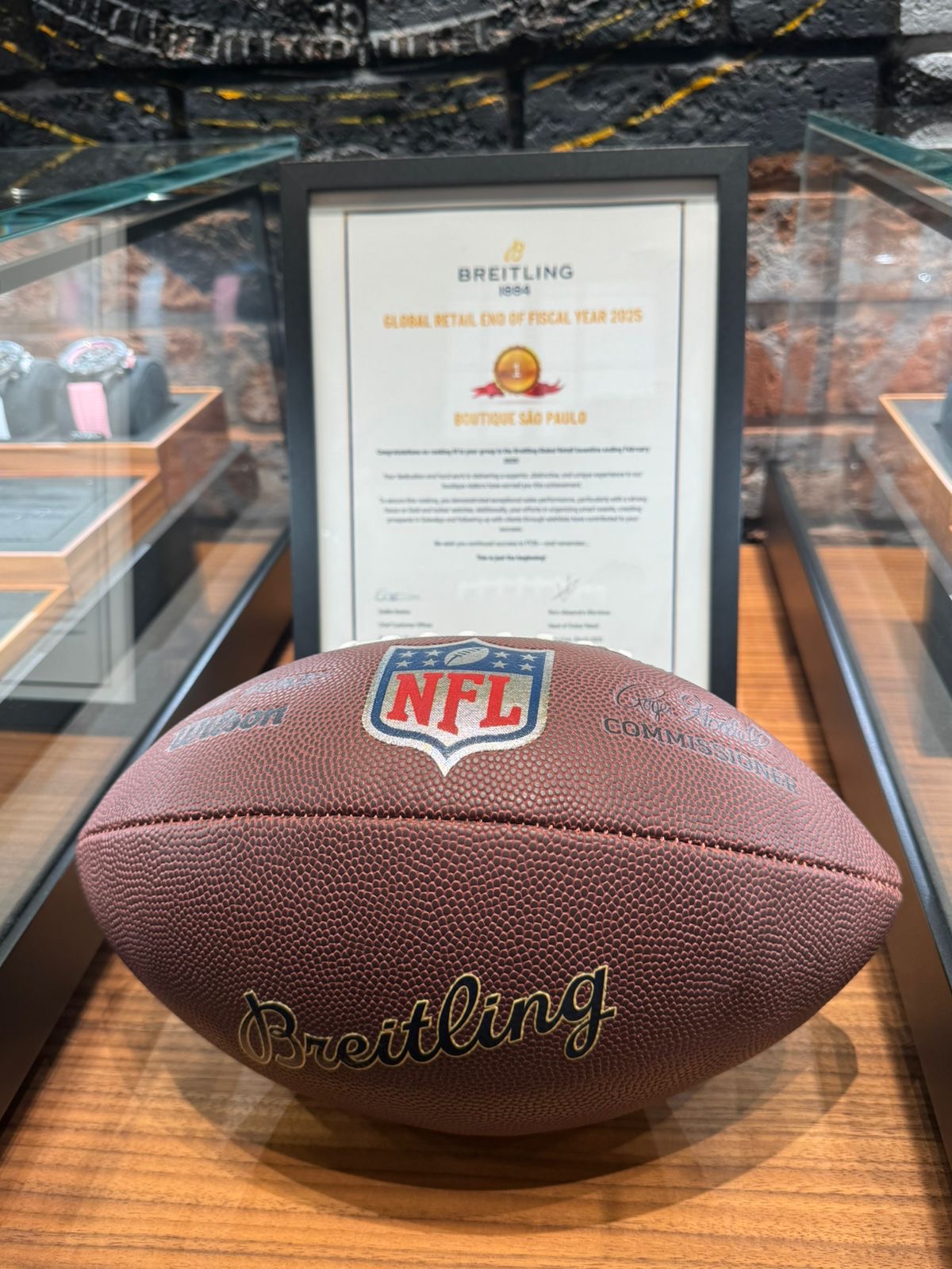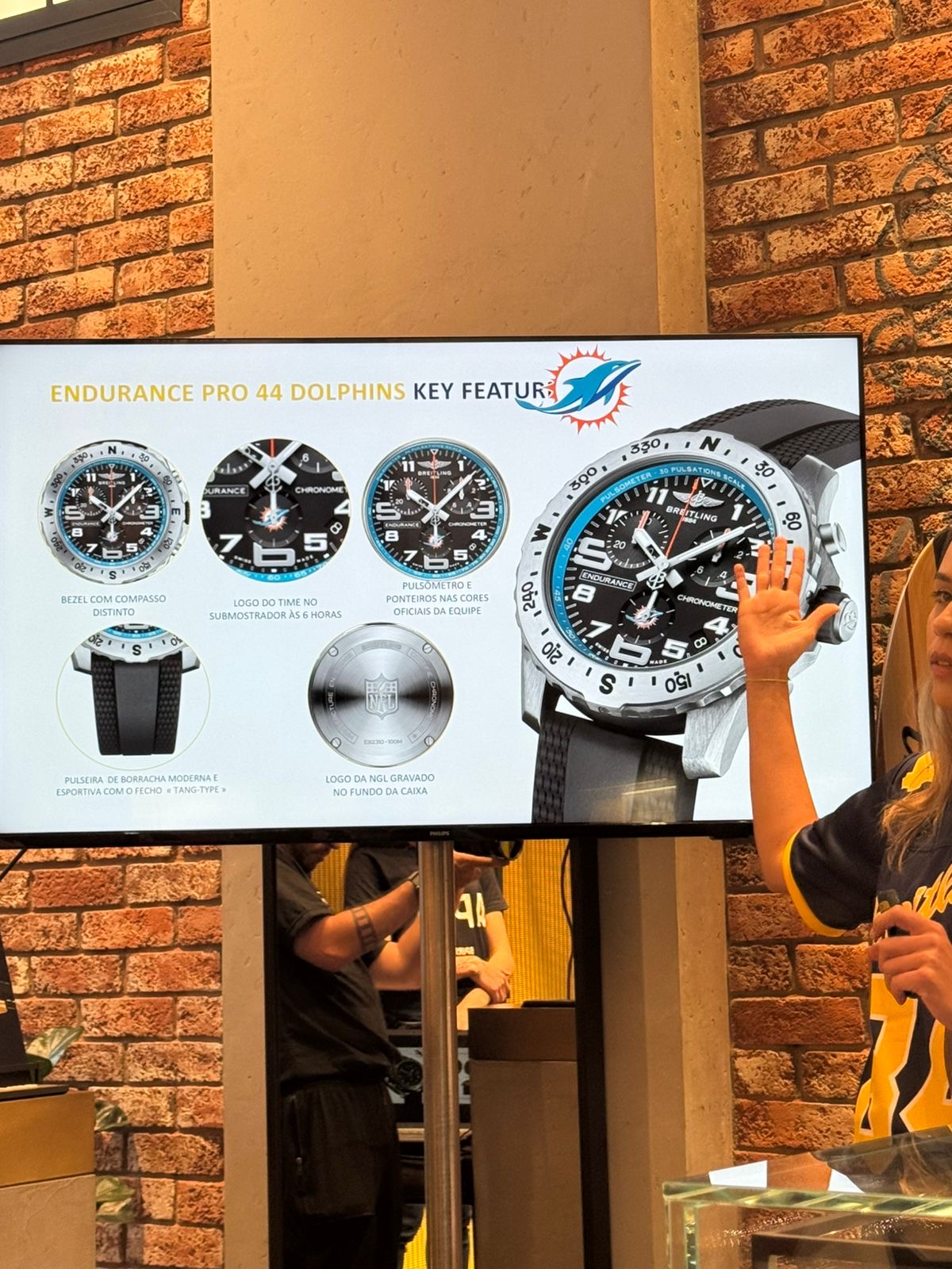 Além do espetáculo em campo, a noite também marcou a parceria da Breitling com a NFL, celebrada com duas coleções exclusivas de relógios — o Chronomat Automatic GMT 40 e o Endurance Pro — que trazem as cores e emblemas dos times da liga.
