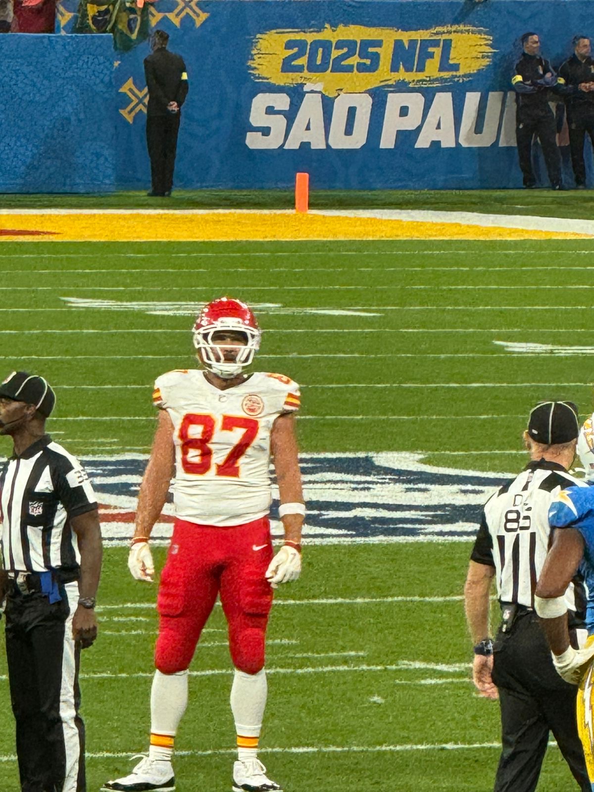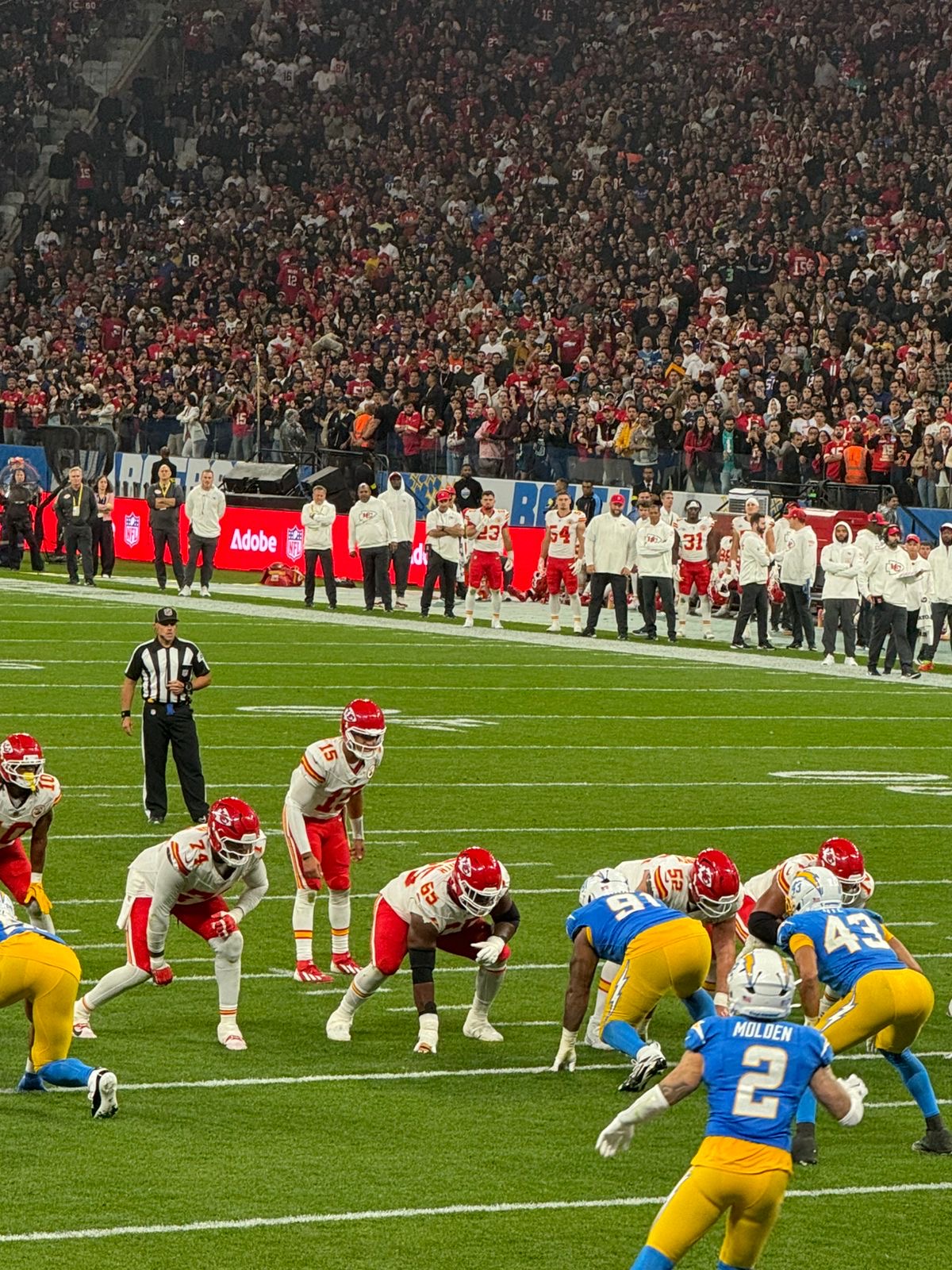 Time azul, Los Angeles Chargers. Time vermelho, Kansas City Chiefs, com o astro da NFL e noivo da Taylor Swift (que no caso não apareceu, para a tristeza dos seus fãs), Travis Kelce, o número 87 do time.